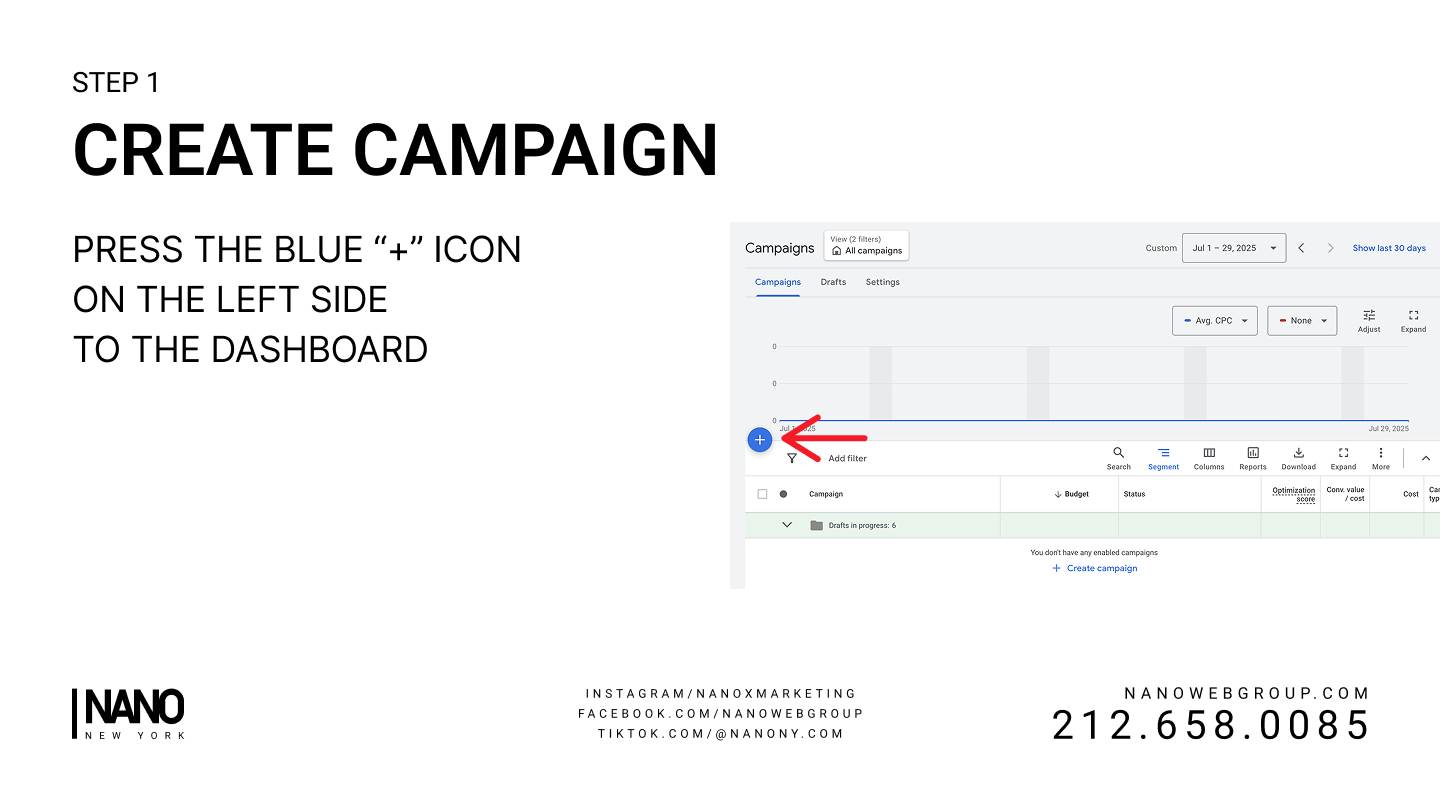 In Google Ads, click the blue “+” icon on the left side of your dashboard.