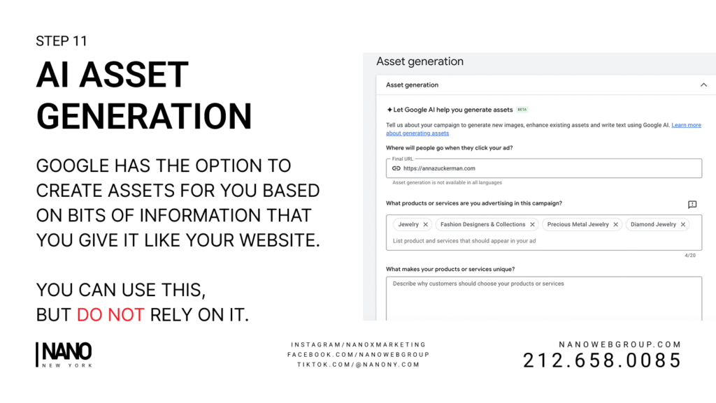 Google can automatically generate assets (headlines, images, and videos) based on your website content.