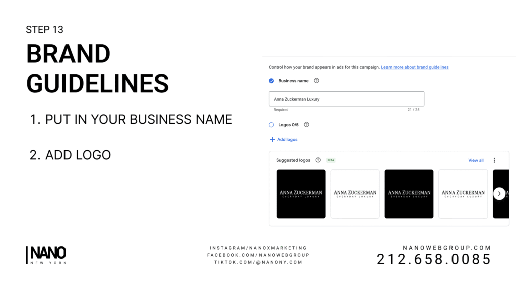 Enter your Business Name and upload your Logo to maintain brand consistency across placements.