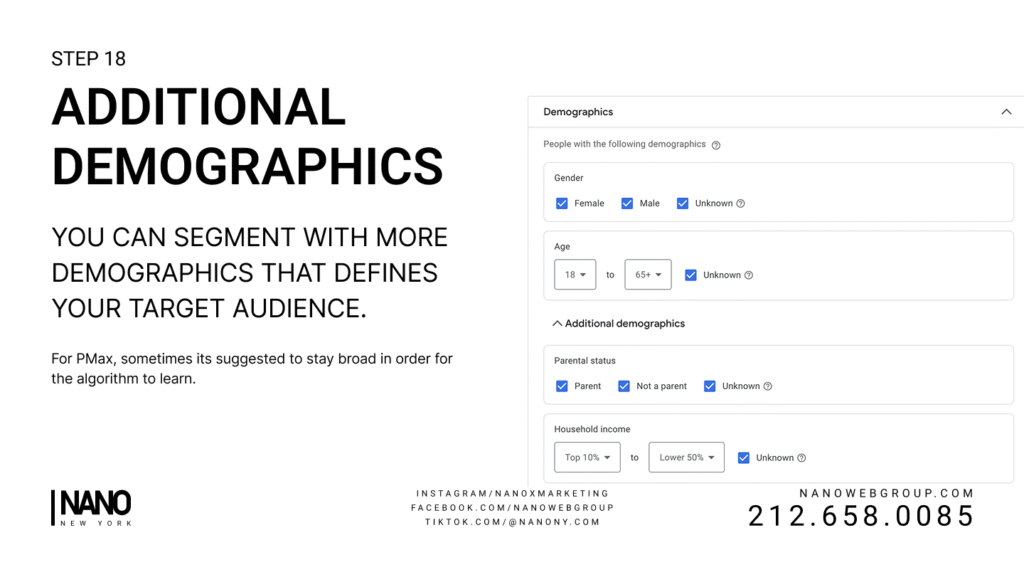 Use Google’s demographic filters (age, income, and household segments) to refine delivery.